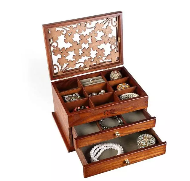 而作為一個(gè)首飾盒廠家的小編,在見(jiàn)過(guò)各式各樣的首飾盒之后還是覺(jué)得木質(zhì)首飾盒最讓我心動(dòng)。在大多數(shù)人眼中,木質(zhì)首飾盒更適合南方婉約女子專用,這種首飾盒造型優(yōu)雅別致,中國(guó)風(fēng)味十足,透出一股別樣風(fēng)情。木質(zhì)首飾盒一般取材于松木、紅木、柞木、黑檀木、楸木?,F(xiàn)在的珠寶首飾盒是這樣分布,戒指墊條、耳釘固定洞、耳釘固定墊、蝴蝶卡遮蓋墊、手表包墊、手鐲包墊、項(xiàng)鏈鉤、小格間、首飾袋、拎手、鏡子。你的所有珠寶首飾都有放置的地方,真是個(gè)百寶箱呢。