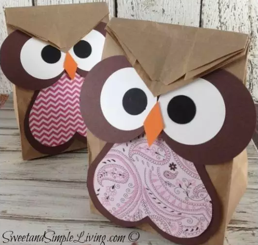 然后用紙和彩色筆制作出貓頭鷹的眼睛,再剪一個小菱形作為它的鼻子,準備就緒之后就可以把它們貼在備好的手提紙袋上了。