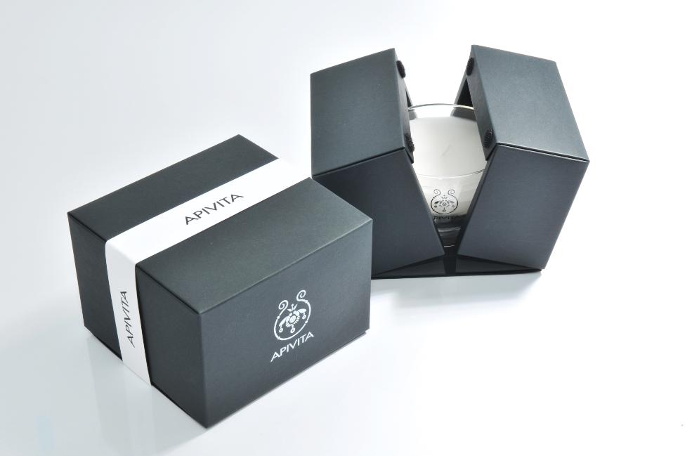 APIVITA香薰蠟燭包裝,黑色卡紙的盒型結(jié)構(gòu)比例合理、結(jié)構(gòu)嚴(yán)謹(jǐn)、造型簡單精美,突顯出盒型的形態(tài)與材質(zhì)美,力求達(dá)商品保護(hù)并襯托出透明蠋臺的層次感,左右開盒的禮盒效果展現(xiàn)商品驚喜的價值感。