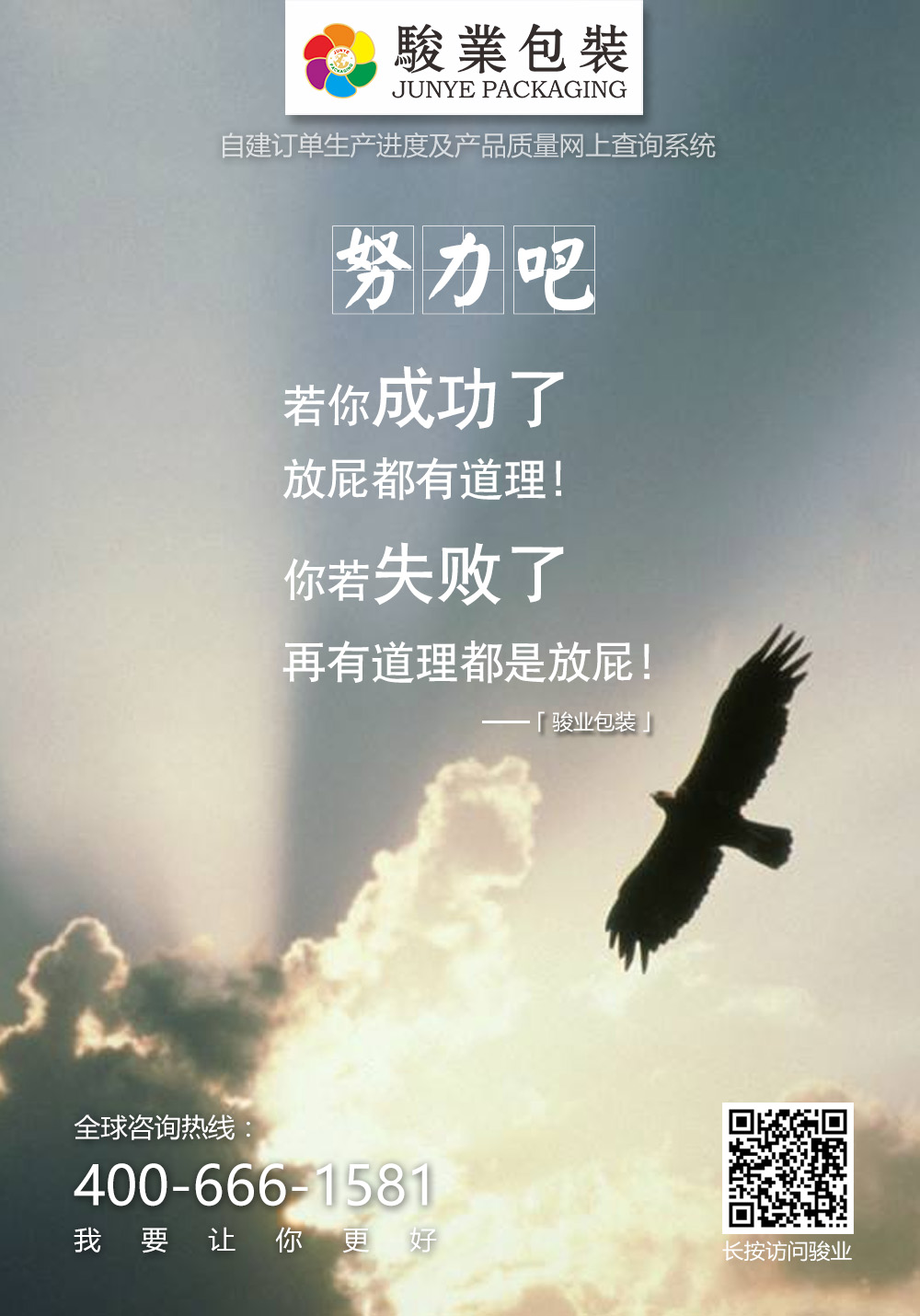 都說成年人的世界里從來沒有容易二字,在這個(gè)鋼筋水泥森林里,我們就像一個(gè)沒有根的蒲公英在這個(gè)城市里飄著,搖擺不定的生活,人來人往,我們每天接觸到各種不同的人,被不同的“氣場”給包圍著,其實(shí)人很容易被周圍的事物影響,或許在來上班的路上剛好聽到一個(gè)人在抱怨生活,那么可能你也會覺得生活不易,從而一整天郁郁寡歡,所以為了不讓駿業(yè)包裝的小伙伴們帶著負(fù)能量工作,駿業(yè)包裝的小張為大家每天準(zhǔn)備了一點(diǎn)正能量的雞湯,不用客氣,大家一起來干了這篇雞湯吧!