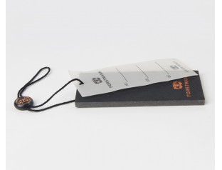 此款衣服吊牌制作采用黑卡紙,商標(biāo)燙紅金,加上一張PVC塑料片。